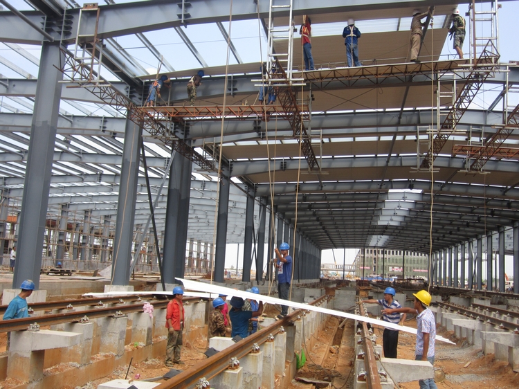 为确保施工节点工期,顺利完成工程收尾攻坚阶段,公司坚持紧密围绕施工的各项指标,以“抢工期、保安全、保质量、控造价”为目标,从严管理,强力推进,不遗余力的抢工期抓进度。目前的工程重点是运用钢结构、土建工程以及三个门卫房,至今形象进度钢结构的钢柱钢梁已全部完成,檩条安装完成80%,屋面安装完成了40%。由于天气炎热,钢构件的温度可谓是“烫手”,大大增加了白天安装的难度;运用库道床基础基本完成,目前正在进行附属用房的砌体工程,与几方的交叉作业是其施工难点;门卫房是常规的钢筋混凝土结构,但门卫房一的一层含分部夹层,建筑高度为11.4m,建筑面积为313.26㎡;门卫房二、门卫三(一层)建筑高度为4.3m,建筑面积为48.64㎡,都属于异形结构,施工难度系数较高。另外还有边坡防护、围墙等分部工程同时进行。
