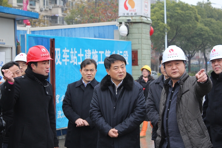在新春的第一个工作日,区委书记曹裕江心系汉阳区第一条地铁线路——武汉市轨道交通四号线二期工地现场施工情况,冒着雨雪交加、寒风凛冽,率队莅临四号线二期八标玉龙路地铁施工现场视察慰问,区建设局长严悌文、集体公司胡红胜董事长陪同视察。视察中,曹裕江书记详细询问了工程建设情况,充分肯定了现场管理人员在恶劣天气环境下仍坚守岗位,并表示希望现场施工人员在新的一年里继续努力,为武汉轨道交通的建设贡献自己的一份力量。