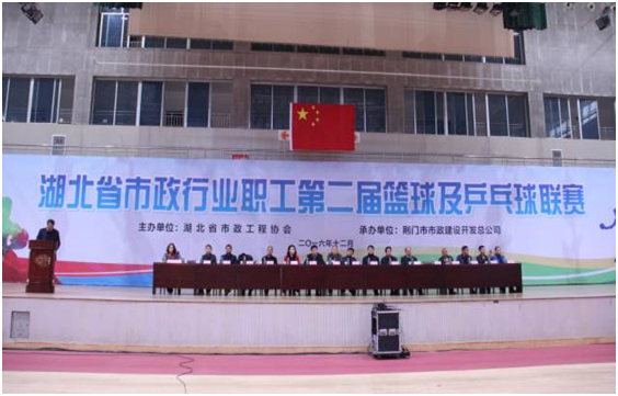 12月12日上午9点,由湖北省市政工程协会主办、荆门市市政建设开发总公司承办的全省市政行业职工第二届篮球联赛在荆门市体育文化中心开幕。省协会秘书长赵亚玲主持开幕式。比赛组委会有关人员、运动员、裁判员及观众共200余人参加开幕式。汉阳市政副总经理、钟鑫市政总经理方紫微亲自带队参加了本次活动。