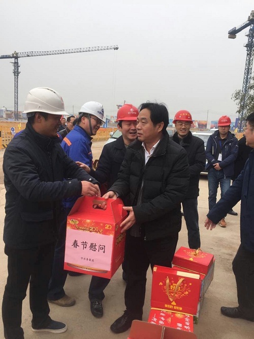 大年三十(1月27日),春节假期第一天,武汉城投集团公司董事长金国发、总经理李兵,武汉水务集团王贤兵董事长一行轻车简从,来到了由武汉水务集团负责代建的夹套河骨干箱涵工程项目建设现场,慰问了节日期间仍坚守岗位、奋战一线工程现场抓紧施工的务工人员,并送上新春祝福和节日慰问。钟鑫公司副总经理尹艳军、项目经理付晓阳、彭轶作为工地代表领取了慰问品,也对城投集团领导一行对值守一线的职工进行春节慰问表示了衷心的谢意。
