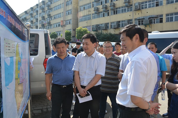 在四台工业园汪祥旺仔细询问了四台片区黑臭水体(朱家老港)污水治理工程的前期准备工作。蔡松就前期现场勘查,拆迁量统计情况、施工现场红线标记、施工用电设备选址、施工现场障碍物统计等工作进行了详细汇报。