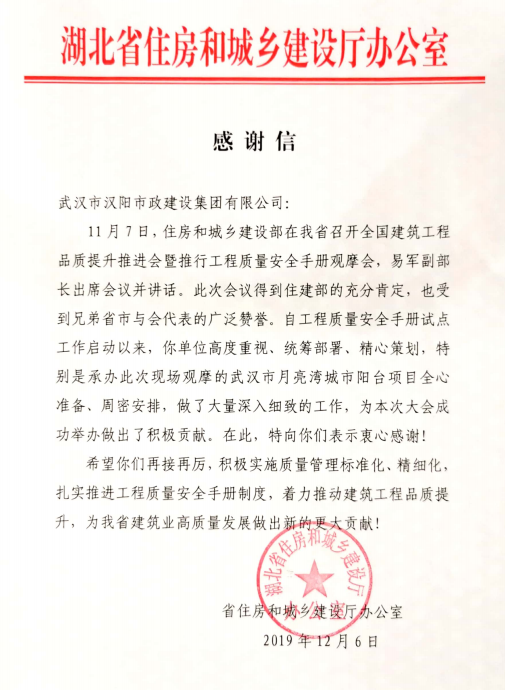 省住建厅在信中这样说到“自工程质量安全手册试点工作启动以来,你单位高度重视、统筹部署、精心策划,特别是承办此次现场观摩的武汉市月亮湾城市阳台项目全心准备、周密安排,做了大量深入细致的工作,为本次大会成功举办做出了积极贡献,在此特想你们表示衷心感谢。”