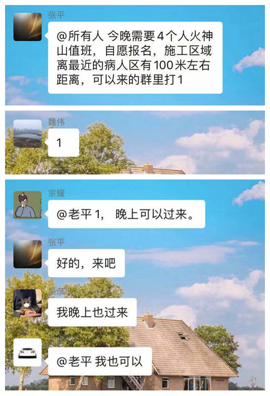 就在一线人员集中隔离之时,2月9日晚,从前线传来需要人员留守夜班执勤的紧急消息,在这个离隔离病房最近仅有50米的区域,危险无处不在。来不及考量,也来不及思索,“我可以”、“我过来”、“+1”的消息瞬间在工作群刷屏,参与火神山建设后正在隔离中的钟鑫建设者纷纷响应,报名参加,选择与危险同行、与责任相伴,以责任担当诠释了什么是“最美建设者”。“没有什么累不累,哪里需要我,我就站在哪里”“在这种关键时期,能贡献一份力量就必须站在前面,我们做的是为了尽早打赢这场疫情阻击战”,舍生忘死、冲锋在前,他们用最美逆行践行着保家卫国、抗击疫情的铮铮誓言。