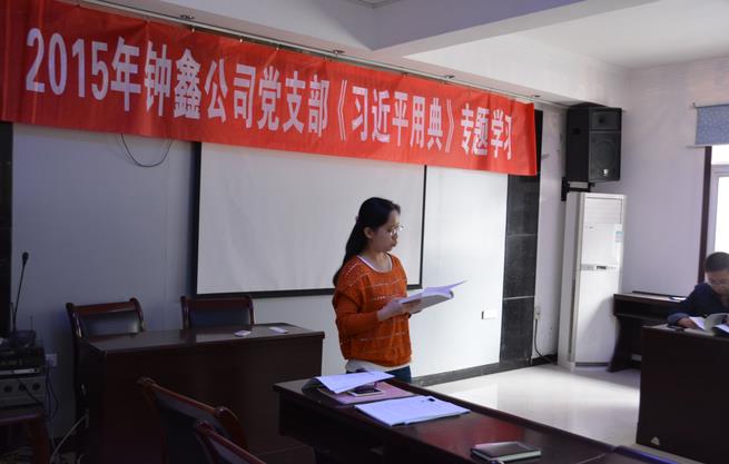 近期,公司全体党员都以自我学习的方式进行了《习近平用典》的学习,为进一步加强党员对《用典》的理解,钟鑫公司于10月9日组织公司全体党员在大会议室政开展“2015钟鑫公司党支部《习近平用典》专题学习”。 首先由主持人宣读“关于开展《习近平用典》专题学习的通知”,并对《习近平用典》一书进行介绍,这本书从习近平总书记数百篇讲话和文章中遴选出使用频率高、影响深远、最能体现习总书记治国理政理念的典故135则,分敬民、为政、修身、任贤、天下、法治等13个篇章,并对习近平总书记引用的每则典故,在解读部分阐述了用典的现实意义,释义部分诠释了古典名句的出处和深邃的寓意。