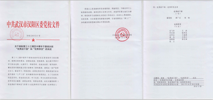 第三十三期中青年干部培训班学员在区委党校学习培训期间,按照区委的要求,把理论武装,党性修养,能力提升贯穿于学习的全过程,认真学习,积极思考,在政治品质、领导素养、解决实际问题的能力等方面都有了新的提高,涌现出一批严格要求自己,勤奋学习、积极进取、成绩优秀的学员,特别是他们在当前开展的“三严三实”系列教育活动中表现突出,为了弘扬党校的优良学风,营造崇尚先进、学习先进、争当先进的良好氛围,经学员民主推荐,班委会研究,校委会同意,决定对董国栋等3名优秀班干部和吴飞舟等11名优秀学员予以表彰(名单附后)。