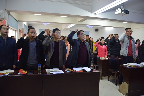 会议伊始,涂书记通报党员到会和11月份党费交纳情况,全体党员齐唱国歌。在涂书记带领下全体党员重温了入党誓词,一起诵读党章第七章《党的纪律》,声音铿锵有力,高亢嘹亮。